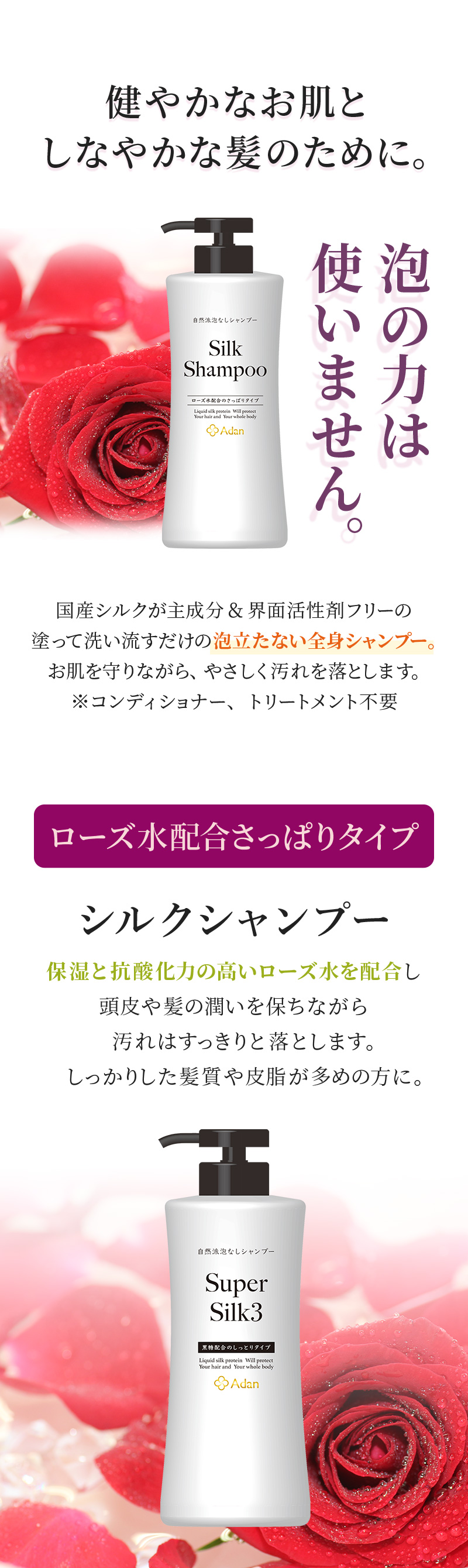 Adan(アーダン) シルクシャンプー ローズ水配合さっぱりタイプ 日本製 / 500ml