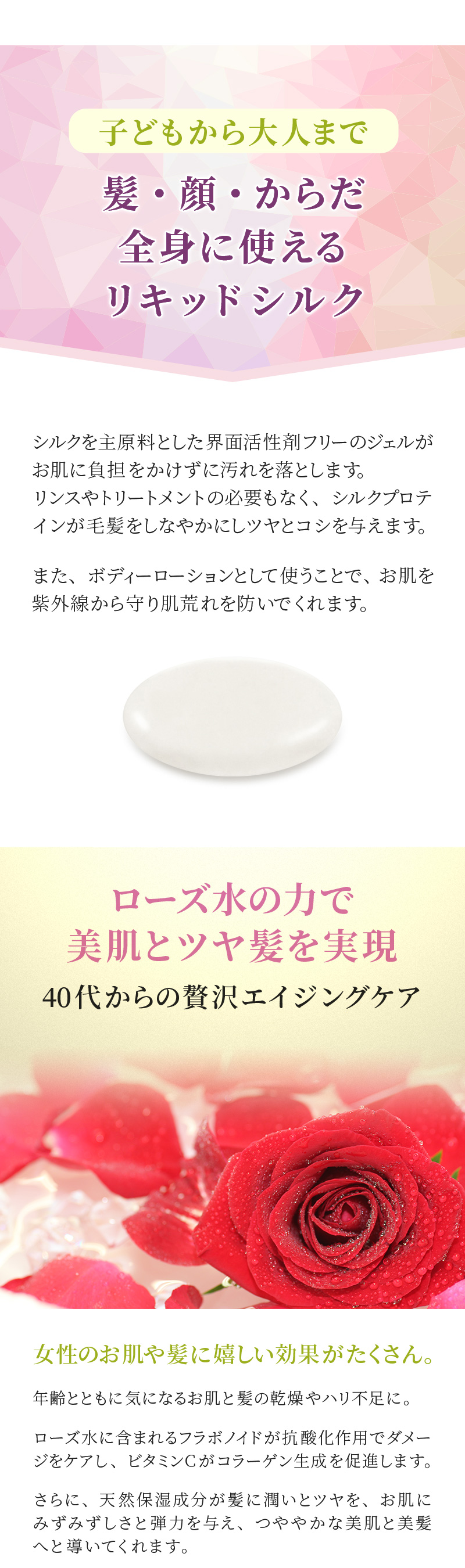 シルクでケアしながら、やさしくお肌や髪を洗う。